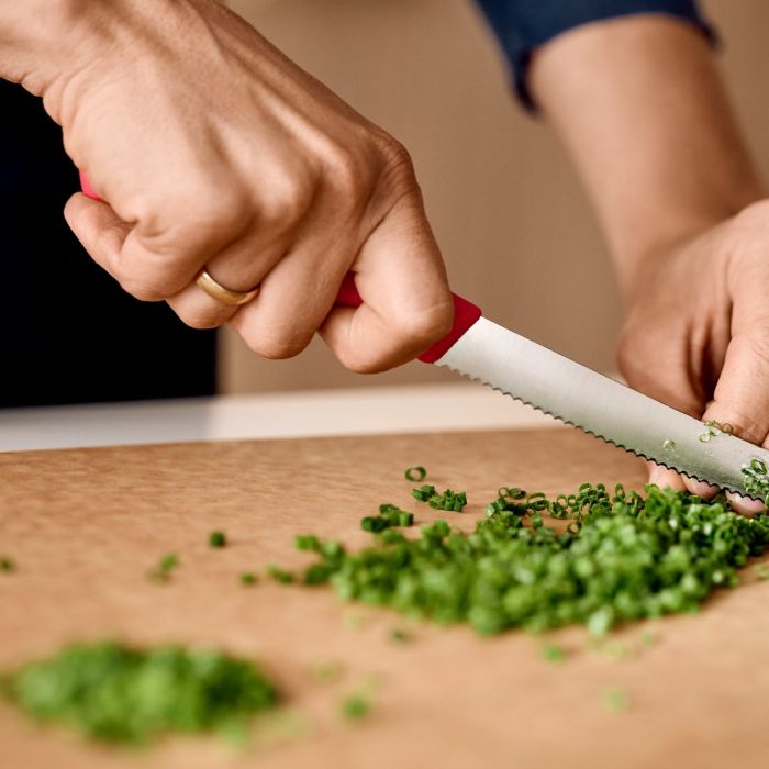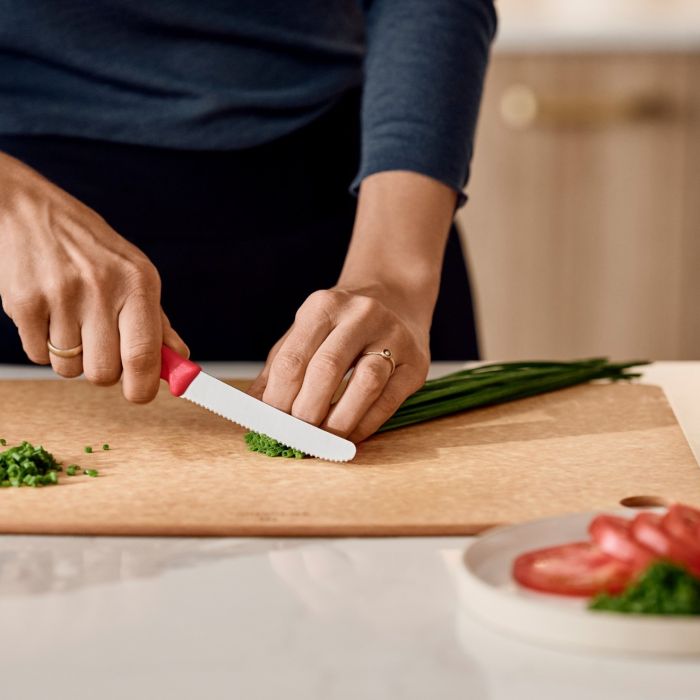 - Ovaj nož za paradajz i sto ima profesionalno oštru oštricu od nehrđajućeg čelika sa valovitim rubom. Idealan je za širok spektar preciznih pripremnih zadataka i omogućava savršeno rezanje. Njegova lagana, ergonomska drška dizajnirana je da pruži optimalnu udobnost i kontrolu. Proizveden u Švicarskoj i siguran za pranje u mašini za suđe, pruža pouzdanost i efikasnost za svakodnevnu upotrebu u kuhinji